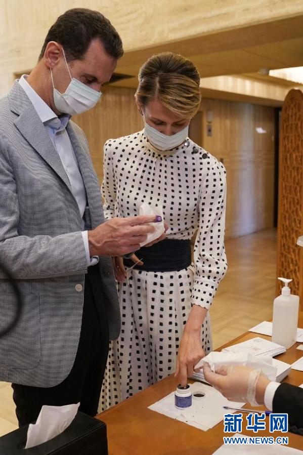 这张2020年7月19日的资料照片显示,叙利亚总统巴沙尔·阿萨德与夫人阿斯玛·阿萨德在叙利亚大马士革参加议会选举投票。