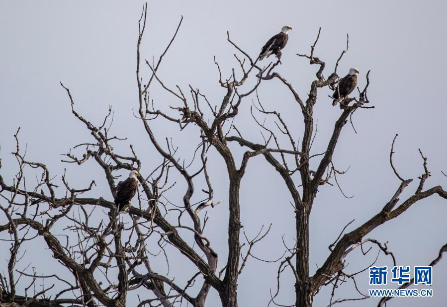 3月8日,在美国伊利诺伊州罗克艾兰,白头海雕落在树上。