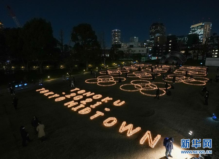 3月11日,在日本东京,人们用写着祝福语的纸制“蜡烛”摆成多种图案,悼念“3·11”大地震遇难者。