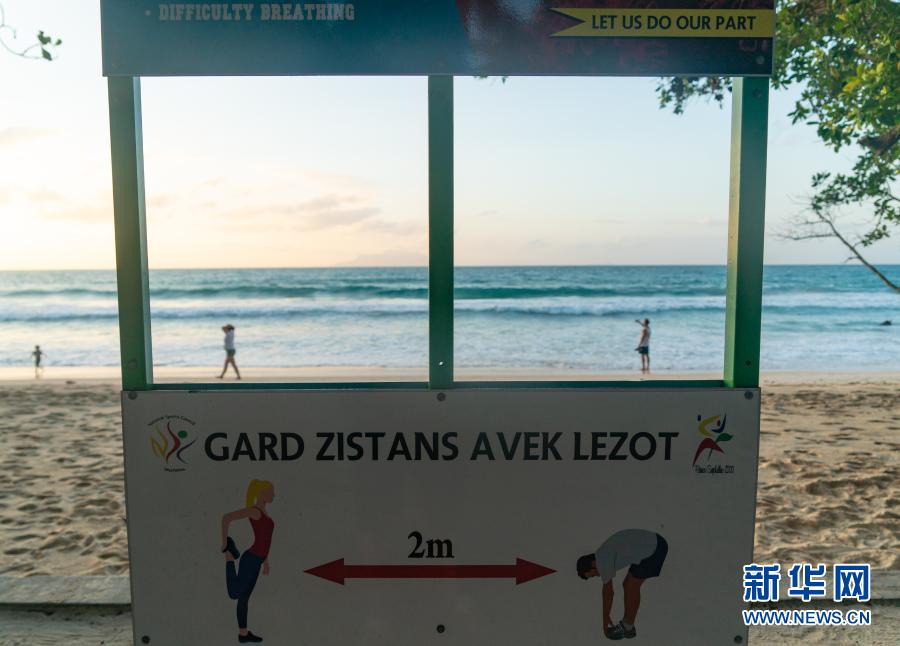 这是1月12日在塞舌尔马埃岛拍摄的提醒民众保持社交距离的提示牌。