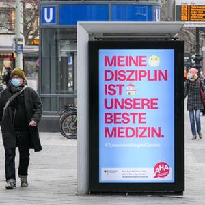 3月12日,在德国首都柏林,一名行人经过写有“我的纪律是我们最好的药物”字样的广告牌。