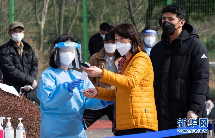 3月14日,医务人员在韩国京畿道华城市一新冠检测点协助人们进行检测。