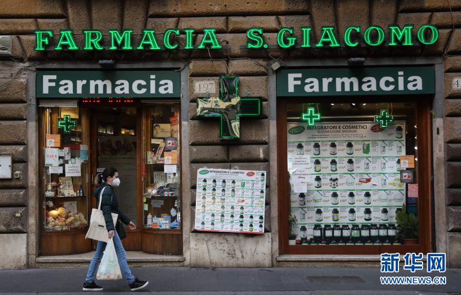 3月15日,一名女子走过意大利首都罗马科尔索大街上一家营业中的药房。15日起,包括首都罗马在内的意大利半数以上地区被划分为疫情防控最高等级的红色区域。新华社记者 程婷婷 摄