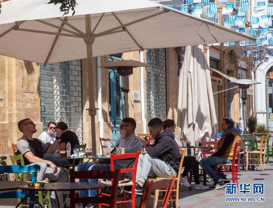 3月16日,人们坐在塞浦路斯首都尼科西亚一家咖啡馆的室外区域。
