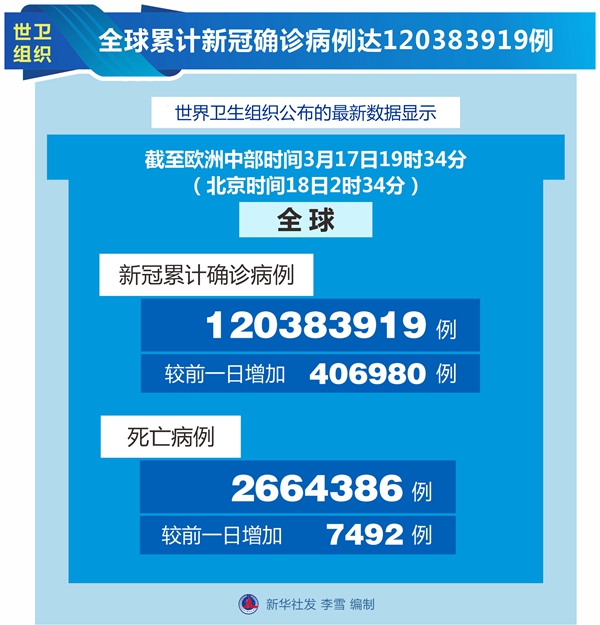 世卫组织网站最新数据显示,截至欧洲中部时间17日19时34分(北京时间18日2时34分),全球确诊病例较前一日增加406980例,达到120383919例;死亡病例增加7492例,达到2664386例。