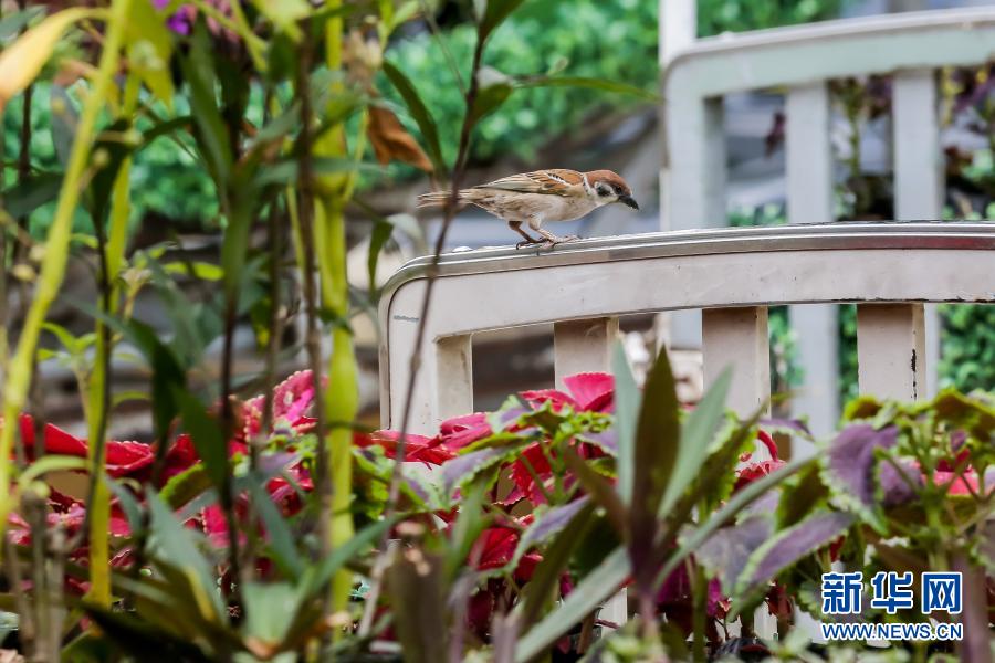 3月18日,在位于马尼拉的菲律宾大学附属菲律宾总医院,一只麻雀站在“低语的花床”艺术装置上。