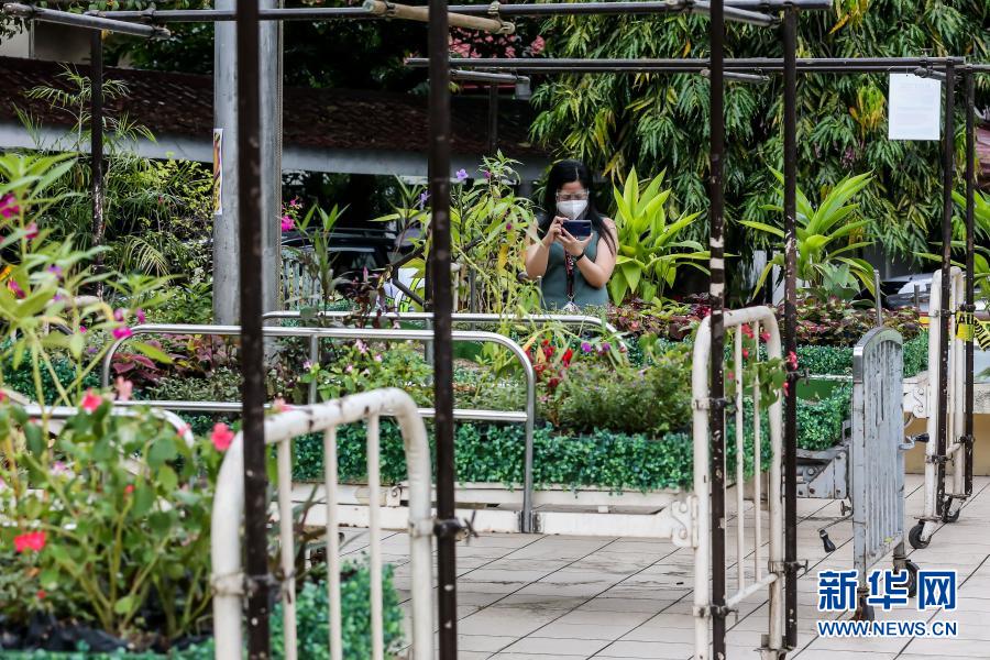 3月18日,在位于马尼拉的菲律宾大学附属菲律宾总医院,一名女子为“低语的花床”艺术装置拍照。
