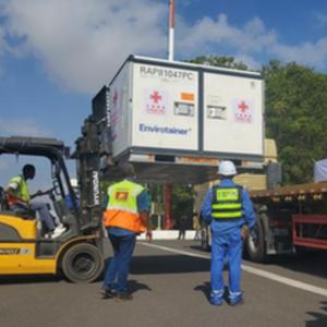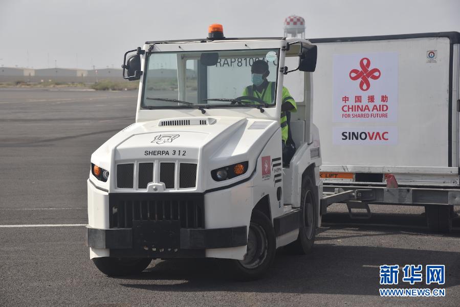 3月18日,在吉布提昂布利国际机场,一名工作人员运送新冠疫苗。