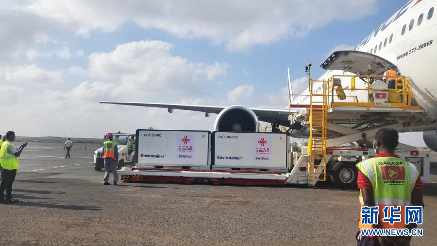 3月18日,在吉布提昂布利国际机场,工作人员从飞机上卸载新冠疫苗。