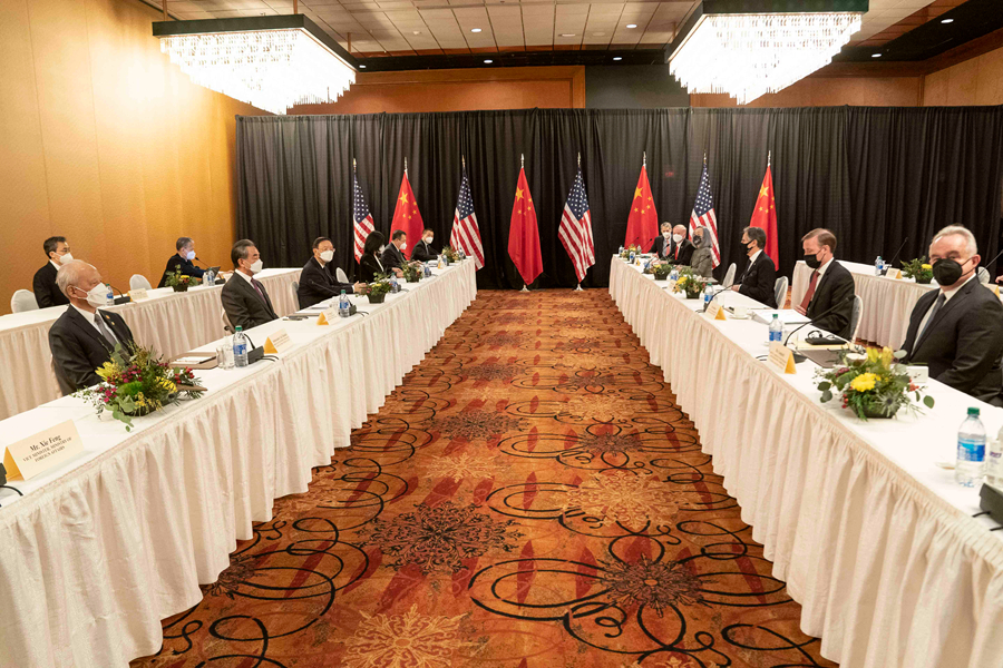3月18日,中共中央政治局委员、中央外事工作委员会办公室主任杨洁篪、国务委员兼外长王毅在安克雷奇同美国国务卿布林肯、总统国家安全事务助理沙利文举行中美高层战略对话。杨洁篪、王毅在中美高层战略对话开场白中阐明中方有关立场。新华社记者 刘杰 摄