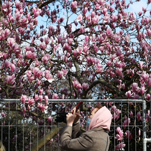 这是3月19日在法国巴黎埃菲尔铁塔脚下的战神广场拍摄的盛放的玉兰花。新华社记者高静摄