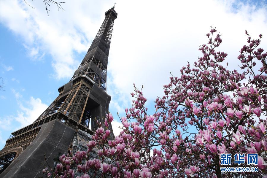 这是3月19日在法国巴黎埃菲尔铁塔脚下的战神广场拍摄的盛放的玉兰花。新华社记者高静摄