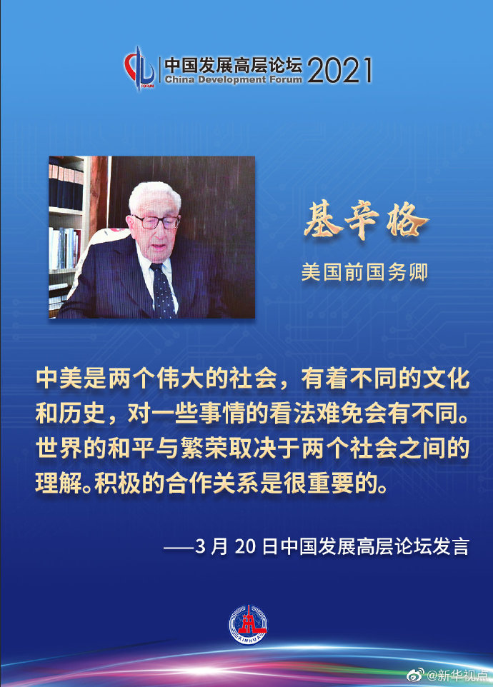 今年恰逢美国前国务卿基辛格首次访华50周年。20日举行的中国发展高层论坛2021经济峰会上,基辛格以线上方式出席峰会。他说,50年前,他第一次来到中国,那时的中国无法与今天的中国相比拟,如今中国发展的巨大变化令人难以置信。针对当前中美关系,基辛格表示,中美是两个伟大的国家,有着不同的文化和历史,对一些事情的看法难免会有不同,但现代科技、全球化传播和经济全球化都要求双方付出比以往更大的努力推进合作。世界的和平与繁荣取决于中美之间的理解。积极的合作关系是很重要的。(记者韩洁、王宾 摄影李鑫)