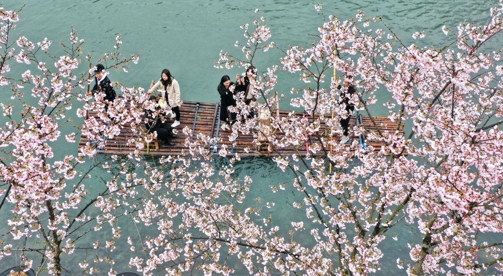 ↑3月20日,游客在浙江省湖州市德清县莫干山镇佛堂村合溪体验竹筏亲水项目