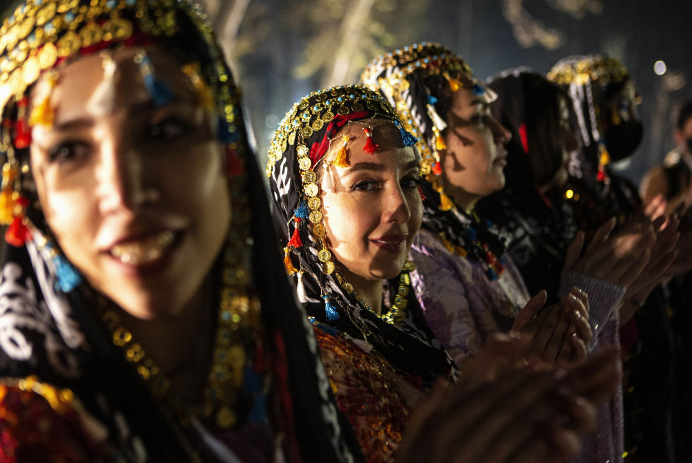 ↑伊朗民众身着传统民族服装在首都德黑兰参加诺鲁孜节前的庆祝活动。