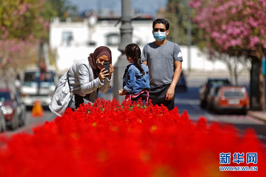 3月21日,人们在黎巴嫩贝鲁特街头盛开的春花前拍照。新华社发(比拉尔·贾维希摄)