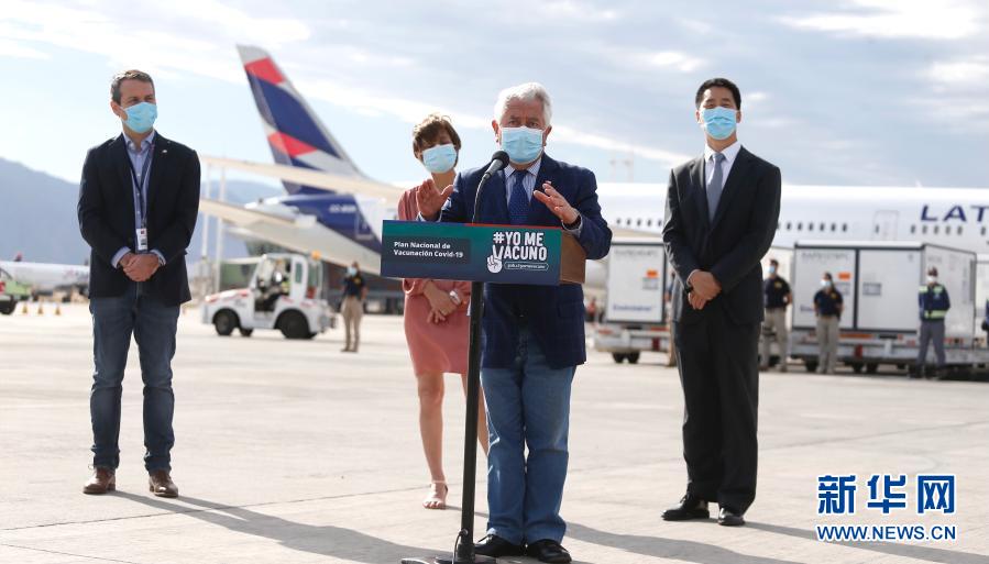 第六批中国科兴公司生产的新冠疫苗21日运抵智利首都圣地亚哥,智利卫生部长帕里斯、中国驻智利大使牛清报赴机场迎接这批疫苗。