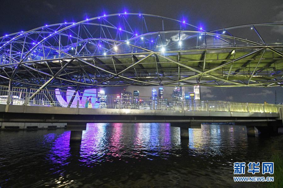 这是3月22日在新加坡拍摄的亮起蓝色灯光的桥梁。