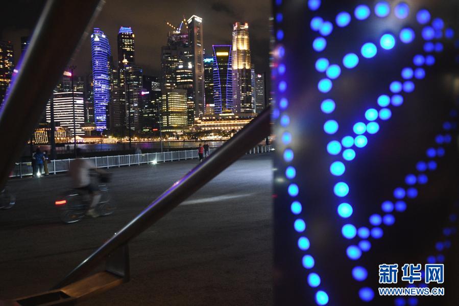 这是3月22日在新加坡拍摄的亮起蓝色灯光的建筑物。