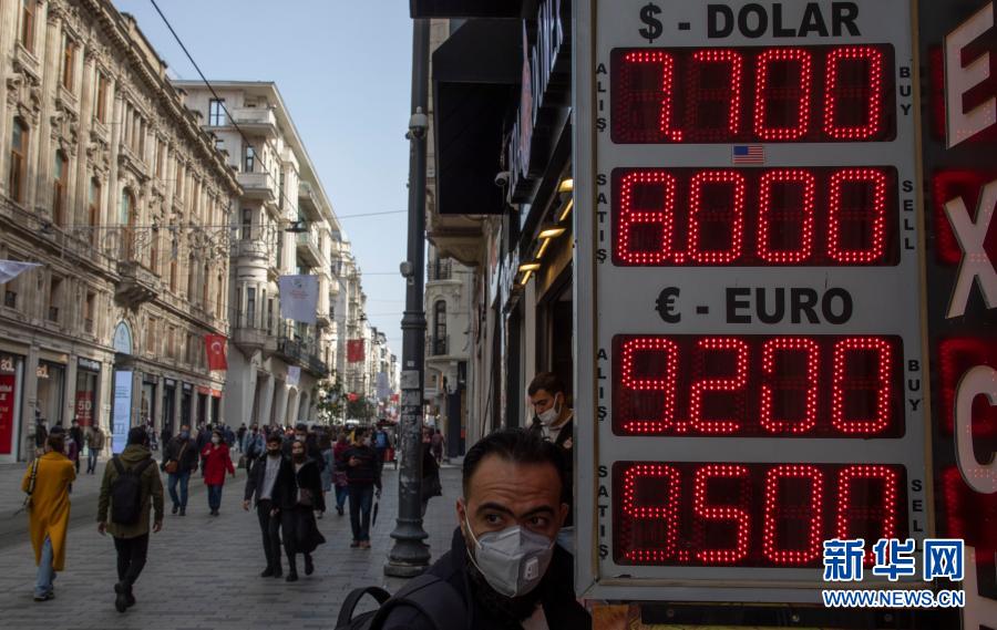 土耳其里拉对美元汇率22日开盘暴跌,跌幅一度超过15%,最低跌至1美元兑换8.485里拉,接近历史最低水平。新华社发(奥斯曼·厄尔萨尔摄)
