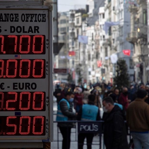 3月22日,在土耳其伊斯坦布尔,行人路过一家货币兑换店。