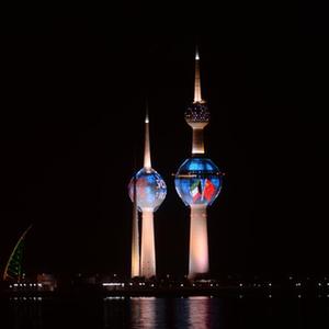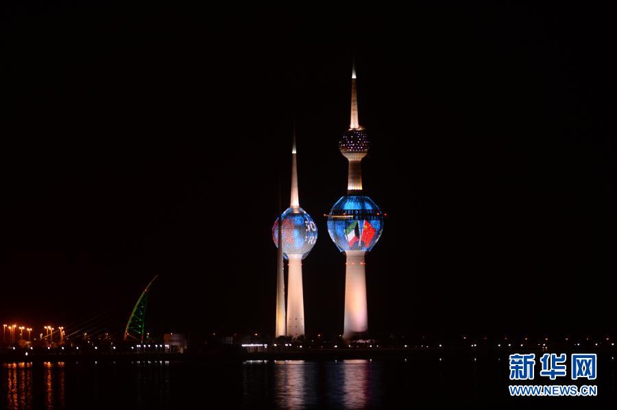科威特塔点亮中科国旗样式灯光庆祝两国建交50周年