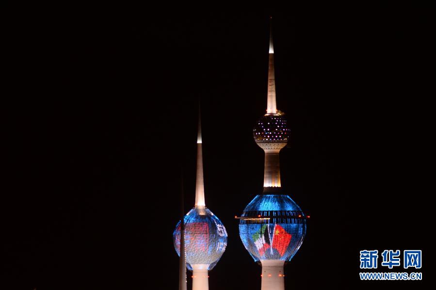 3月22日,在科威特首都科威特城,标志性建筑科威特塔点亮中科两国国旗样式的灯光,庆祝中国和科威特建交50周年。当日是中国和科威特建交50周年纪念日。新华社发
