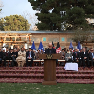 2020年2月29日,在阿富汗首都喀布尔,美国国防部长马克·埃斯珀(前右)、阿富汗总统阿什拉夫·加尼(前中)和北约秘书长延斯·斯托尔滕贝格在新闻发布会上。当日,美国和阿富汗塔利班在卡塔尔首都多哈签署旨在结束阿富汗战争的和平协议。新华社发