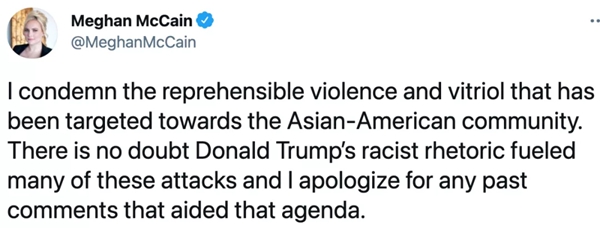 梅根·麦凯恩在推特中称:“我谴责针对亚裔美国人社区的暴力和谩骂。毫无疑问,唐纳德·特朗普的种族主义言论助长了许多此类攻击,我对过去任何助长了这一行为的言论表示歉意。”