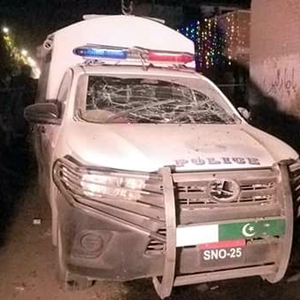 3月23日,在巴基斯坦俾路支省杰曼,一辆警车在爆炸中受损。新华社发