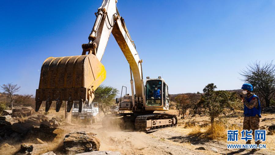 这是3月3日中国维和工兵分队在索托尼用履带挖掘机开辟通道。