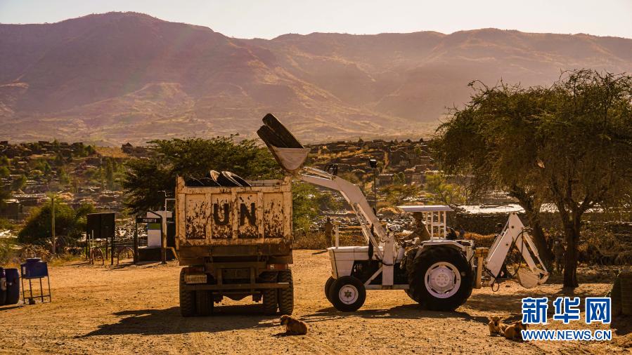 这是3月11日中国维和工兵分队在索托尼清理营区内的废旧轮胎。新华社发(李晖摄)