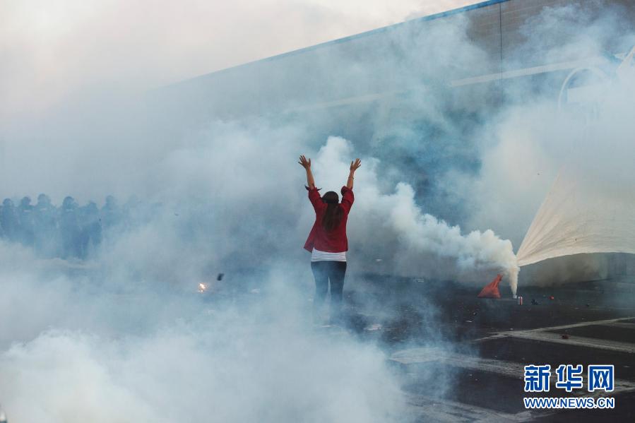2020年5月30日晚,在美国明尼苏达州明尼阿波利斯市,抗议者在防暴警察施放的催泪瓦斯中与警察对峙。明尼苏达州非洲裔男子乔治·弗洛伊德2020年5月遭白人警察暴力执法后窒息死亡,引发全美大规模抗议。新华社发(安格斯·亚历山大摄)