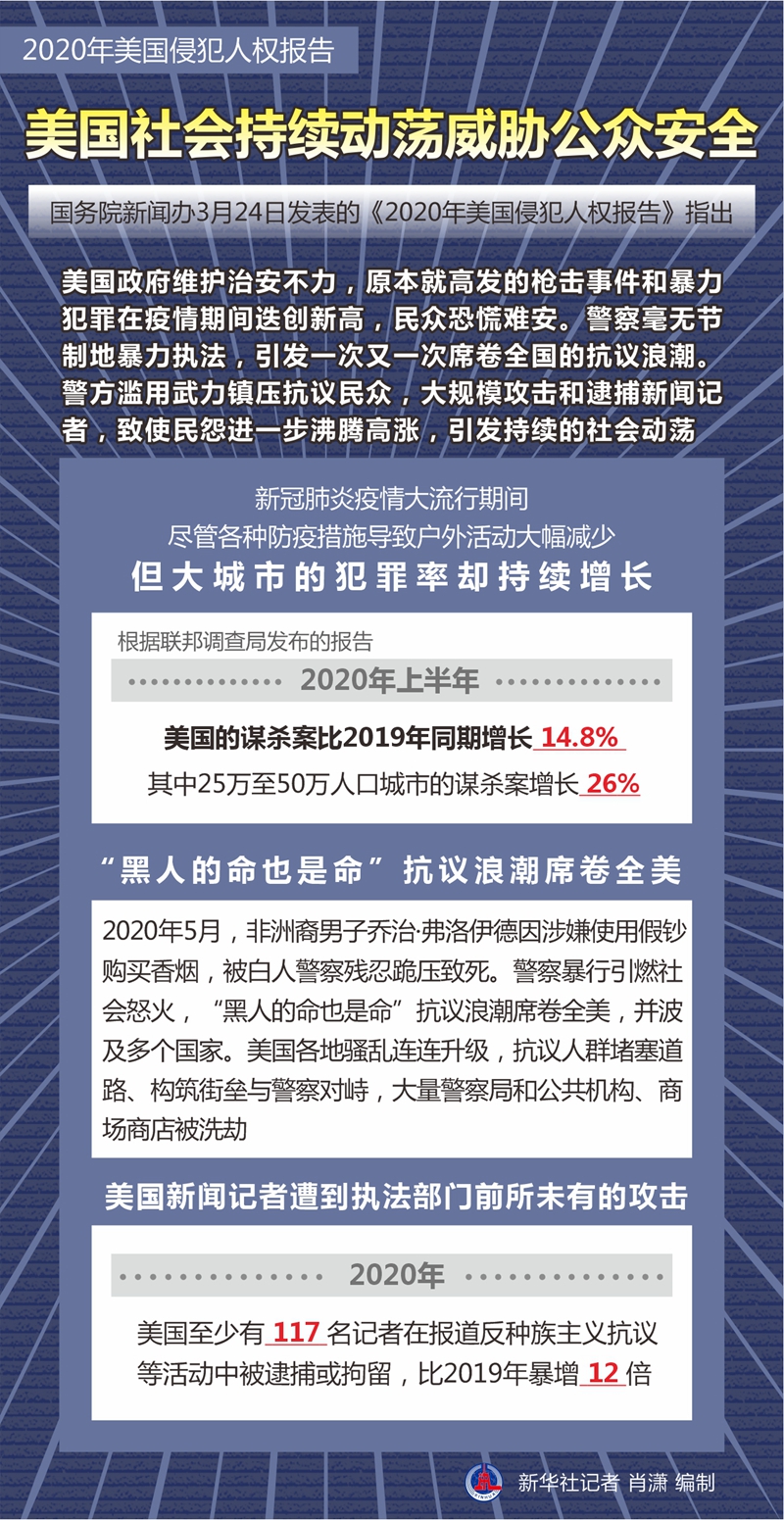 新华社北京3月24日电 国务院新闻办24日发表的《2020年美国侵犯人权报告》指出,美国社会持续动荡威胁公众安全。