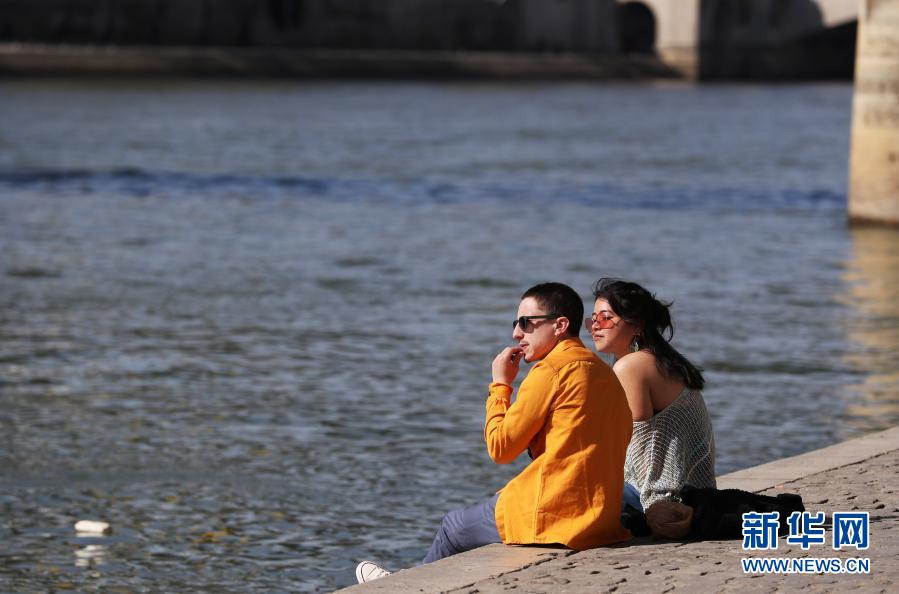 3月24日,一对情侣在法国巴黎塞纳河畔晒太阳。