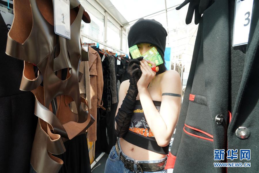 3月24日,一名参展商在DHUB设计汇现场展示参展时装。