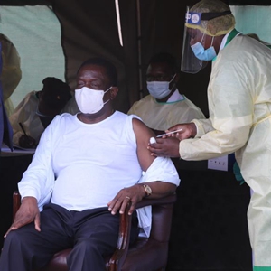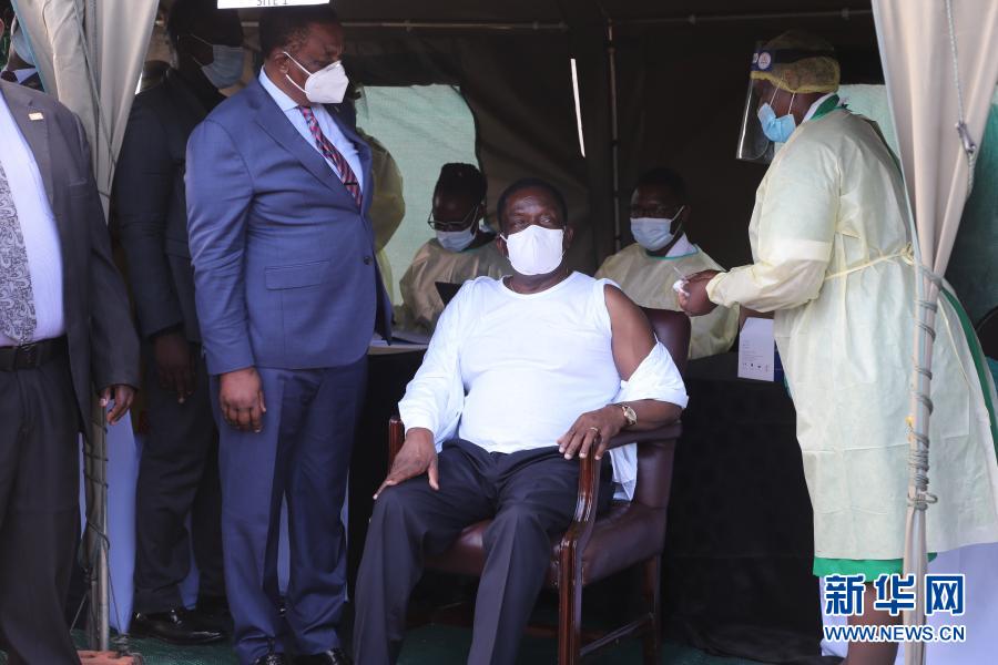 3月24日,津巴布韦总统姆南加古瓦(中)在维多利亚瀑布城准备接种新冠疫苗。新华社发(陈雅琴摄)