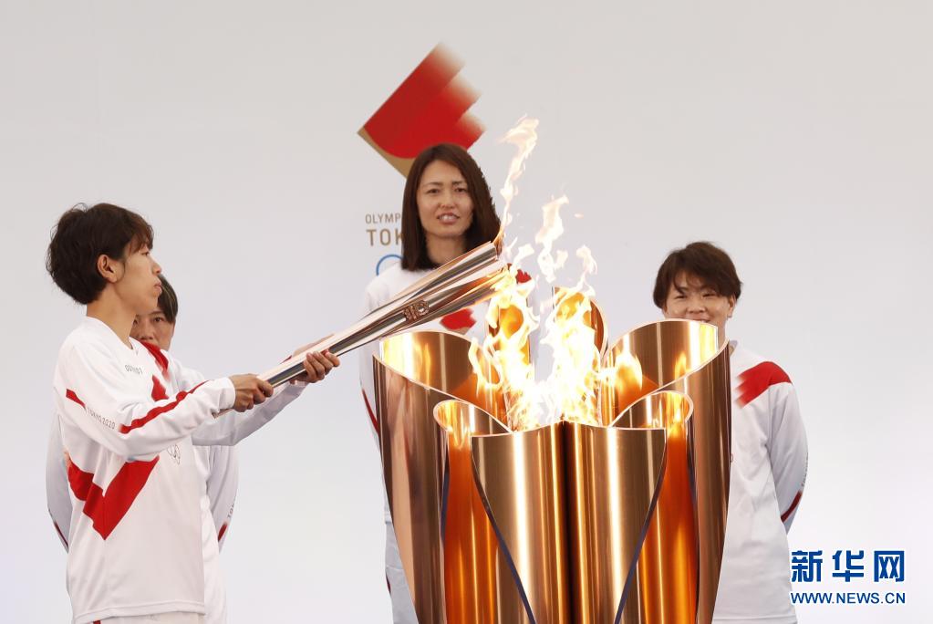 3月25日,日本前女足队员岩清水梓(左)点燃手中的火炬。新华社/POOL/金敬勋