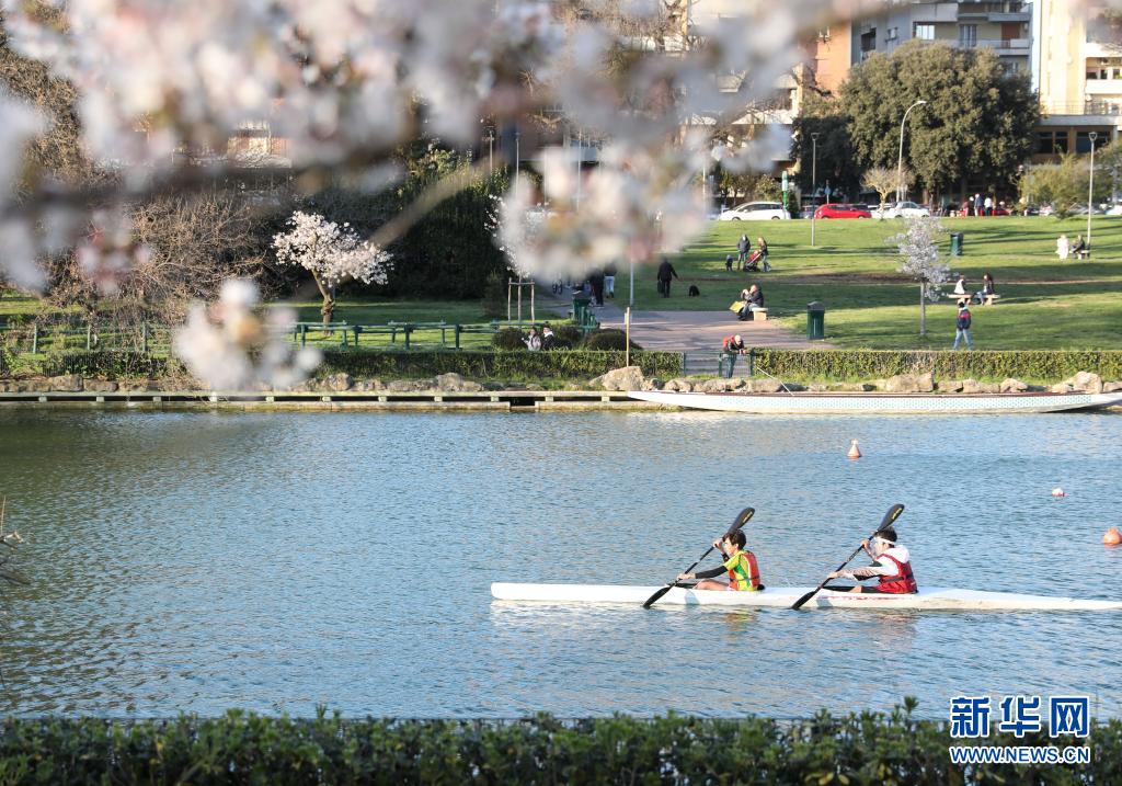 3月24日,市民在意大利首都罗马的一处水面上划船。新华社记者 程婷婷 摄
