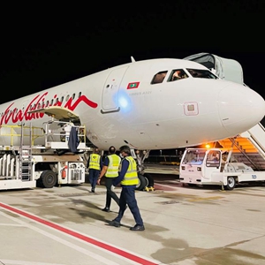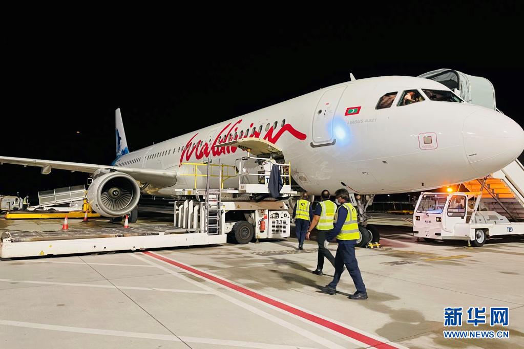 3月24日,载有中国政府援助马尔代夫的首批新冠疫苗及部分防疫物资的飞机抵达马尔代夫马累维拉纳国际机场(手机照片)。