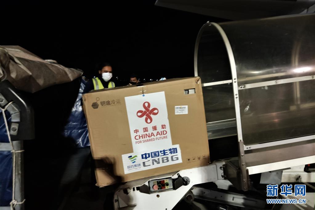 中国政府援助马尔代夫的首批新冠疫苗及部分防疫物资24日深夜运抵马累。新华社发(国英斌摄)