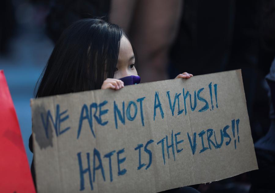 3月21日,在美国纽约,一名女孩参加集会抗议针对亚裔的歧视行为和仇恨犯罪。新华社记者 王迎 摄