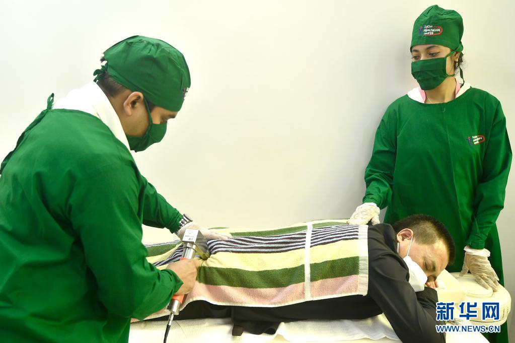 这是患者在孟加拉国首都达卡的“索西健康护理”中医诊所接受治疗(3月13日摄)。