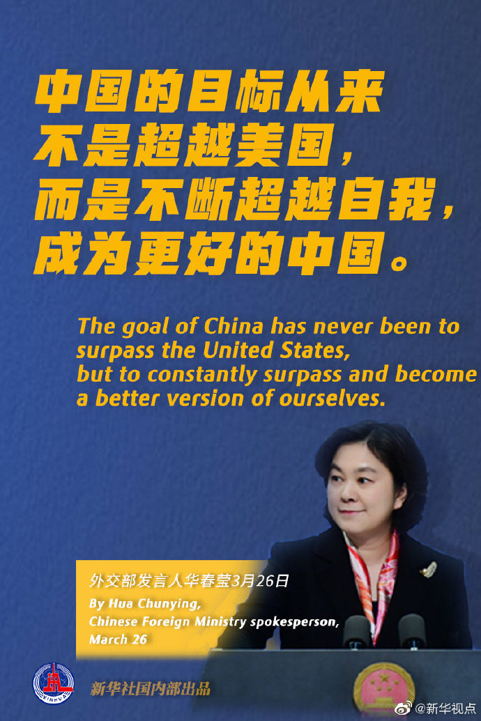 针对美国总统拜登日前称其任内“不会让中国超越美国”,外交部发言人华春莹3月26日表示,中国的目标从来不是超越美国,而是不断超越自我,成为更好的中国。
