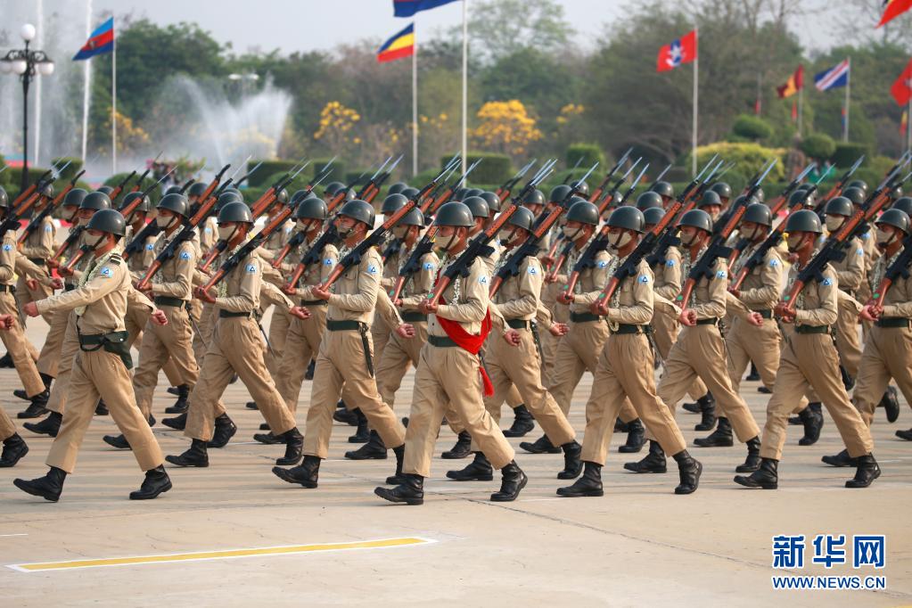 3月27日,士兵在缅甸内比都参加建军76周年阅兵式。