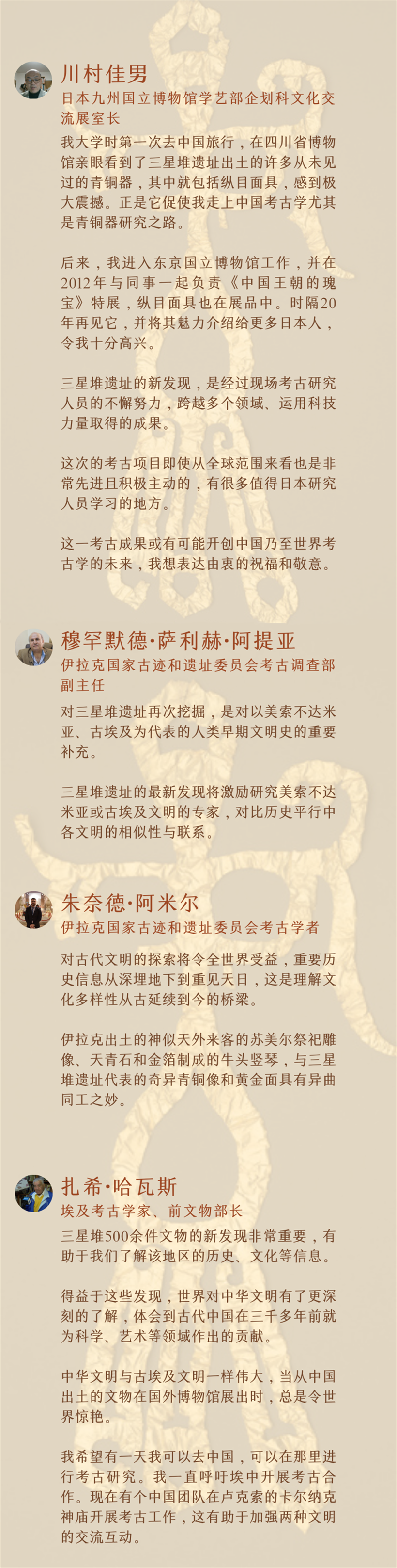 在接受新华社记者采访时,有人回忆起当年正是对三星堆文物的惊鸿一瞥吸引自己投身考古,有人惊叹于三星堆新发现与其他古文明之间的异曲同工,有人感慨古文明探索有益于世界,还有人期待疫情后有机会与中方展开更深入的考古合作……海外这些点赞,确实走心!
