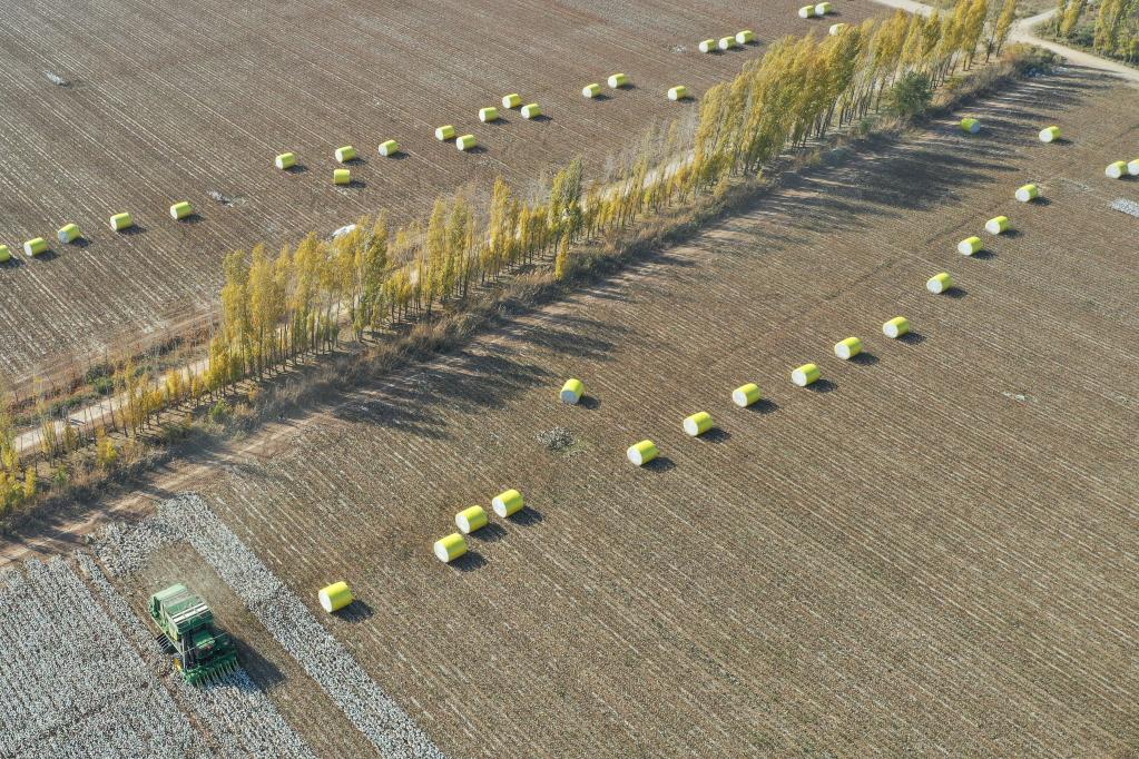 在新疆玛纳斯县乐土驿镇文家庄村,一台采棉机在棉田里采摘棉花(2020年10月17日摄,无人机照片)。新华社记者 丁磊 摄