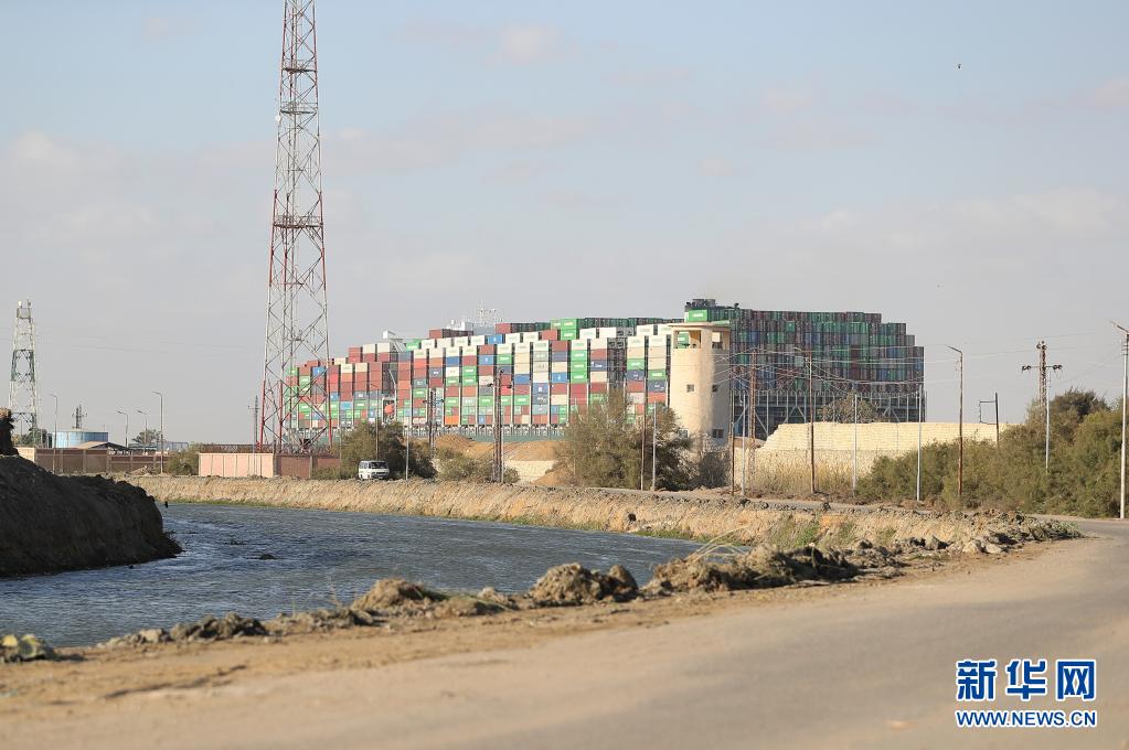 这是3月29日拍摄的移动至埃及苏伊士运河正常航道上的重型货轮。