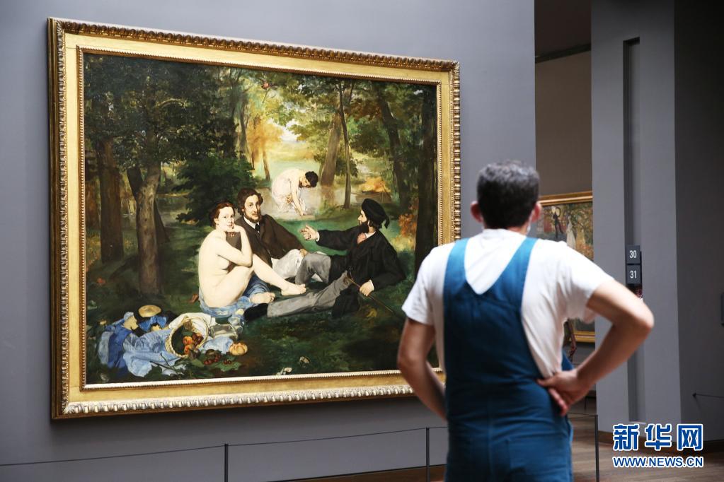 这是2020年6月23日一名男子在法国巴黎奥赛博物馆观赏马奈名画《草地上的午餐》的资料照片。