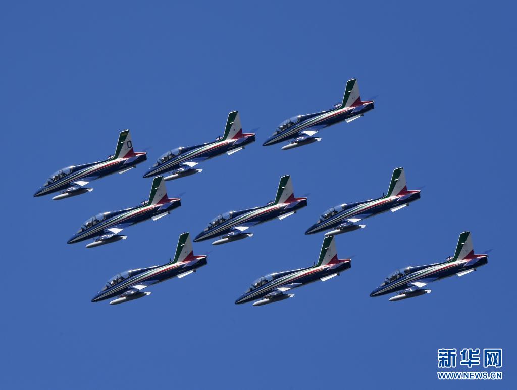 当日,意大利“三色箭”飞行表演队在意大利首都罗马举行飞行表演,庆祝意大利空军建立98周年。